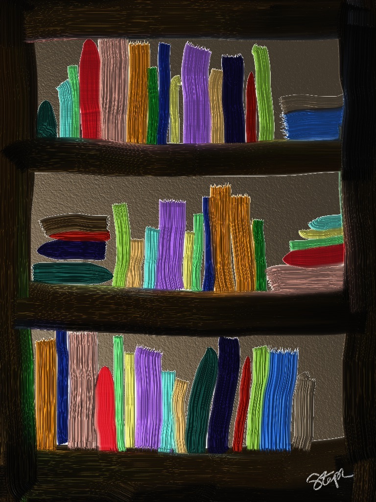 Tuesday, August 16, 2011. Today’s post is inspired by the NaBloPoMo prompt, “Do you prefer to own books or borrow them from a friend or the library?” I created the bookcase on my iPad using ArtRage.