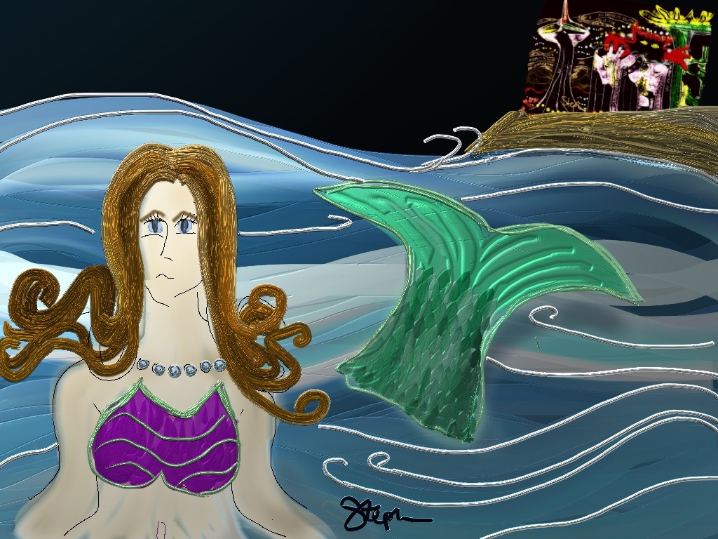 Thursday, November 6, 2014. Exhausted and speechless, I doodled this image on my iPad using ArtRage. My doodle was inspired by a writing prompt from Writing.com: “She goes for a swim but can’t come back, for she has become a mermaid.”