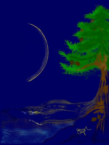 Tuesday, November 25, 2014. Inspired by the lunar cycle this season, I created both the image and haiku, “A Pinion Salute.” (I doodled using ArtRage 3.)